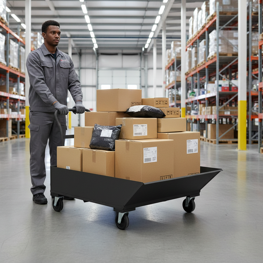 El carro tolva metálico modelo 12124 está diseñado para el transporte y descarga eficiente de materiales sueltos en entornos industriales.