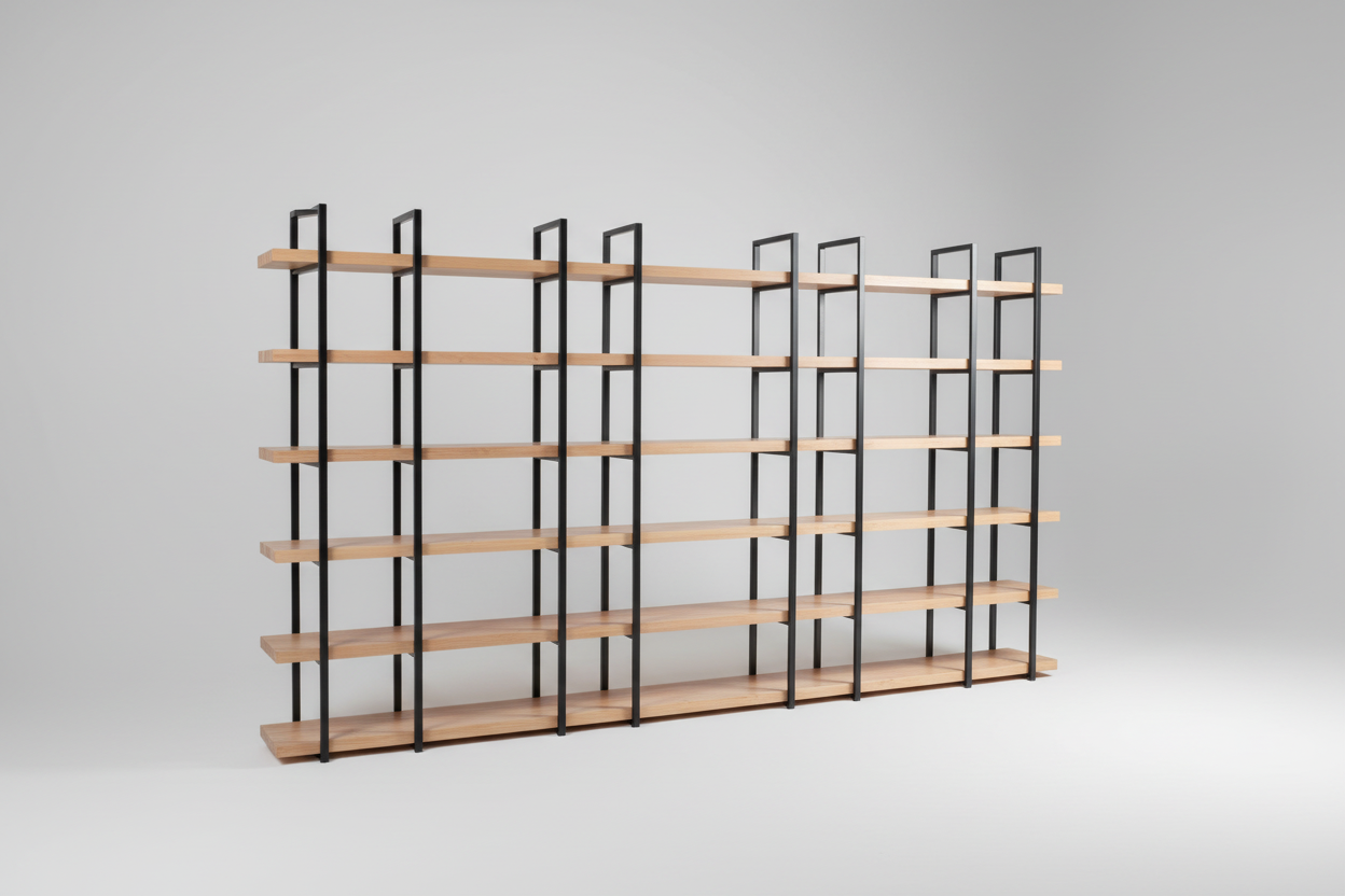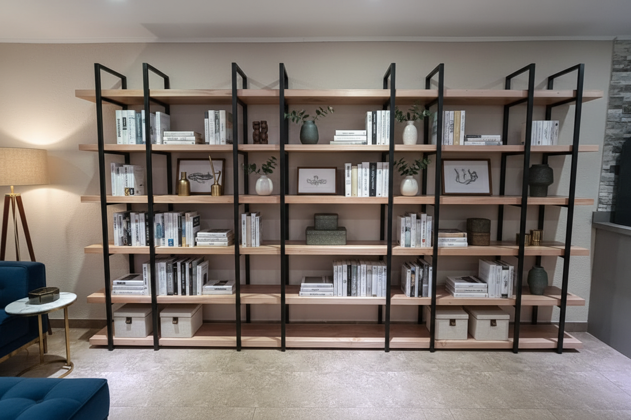Fabricamos estante a medida de tu espacio, variedad de maderas y diseños de soportes desde 2 a 8 pilares de acero.